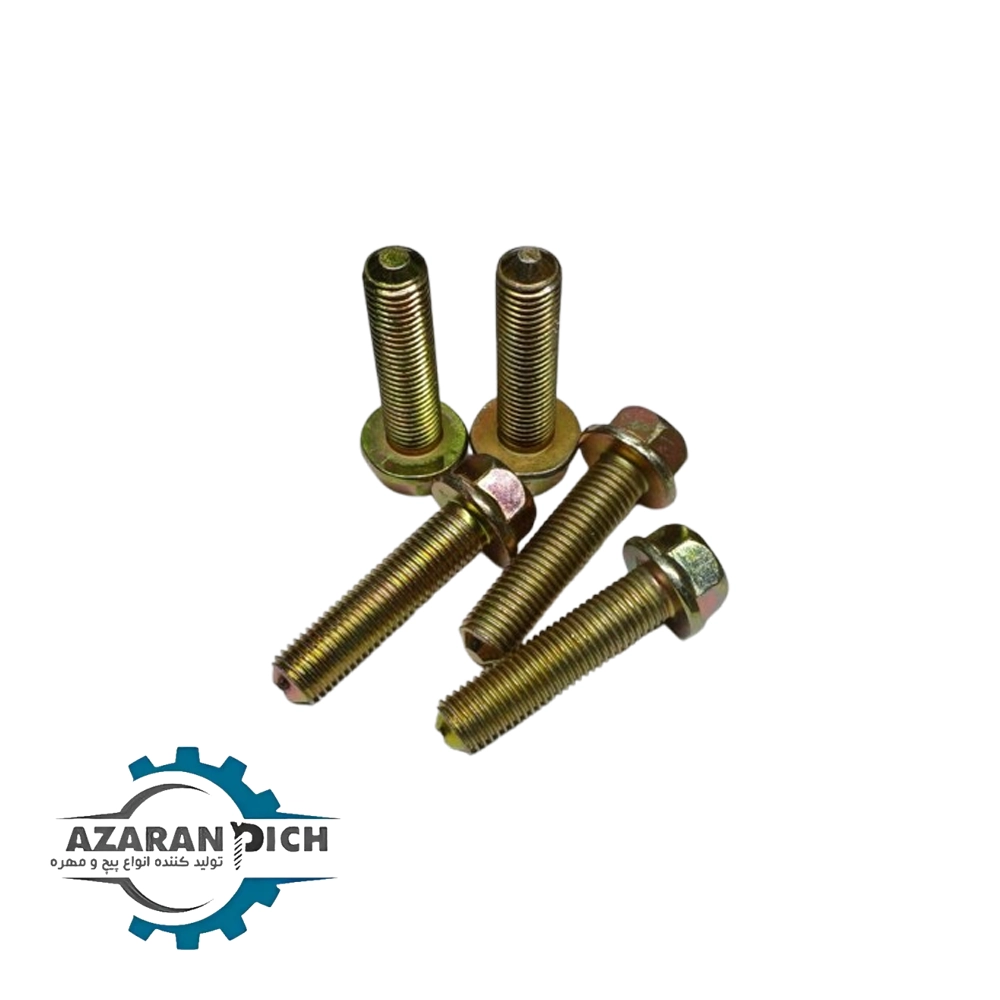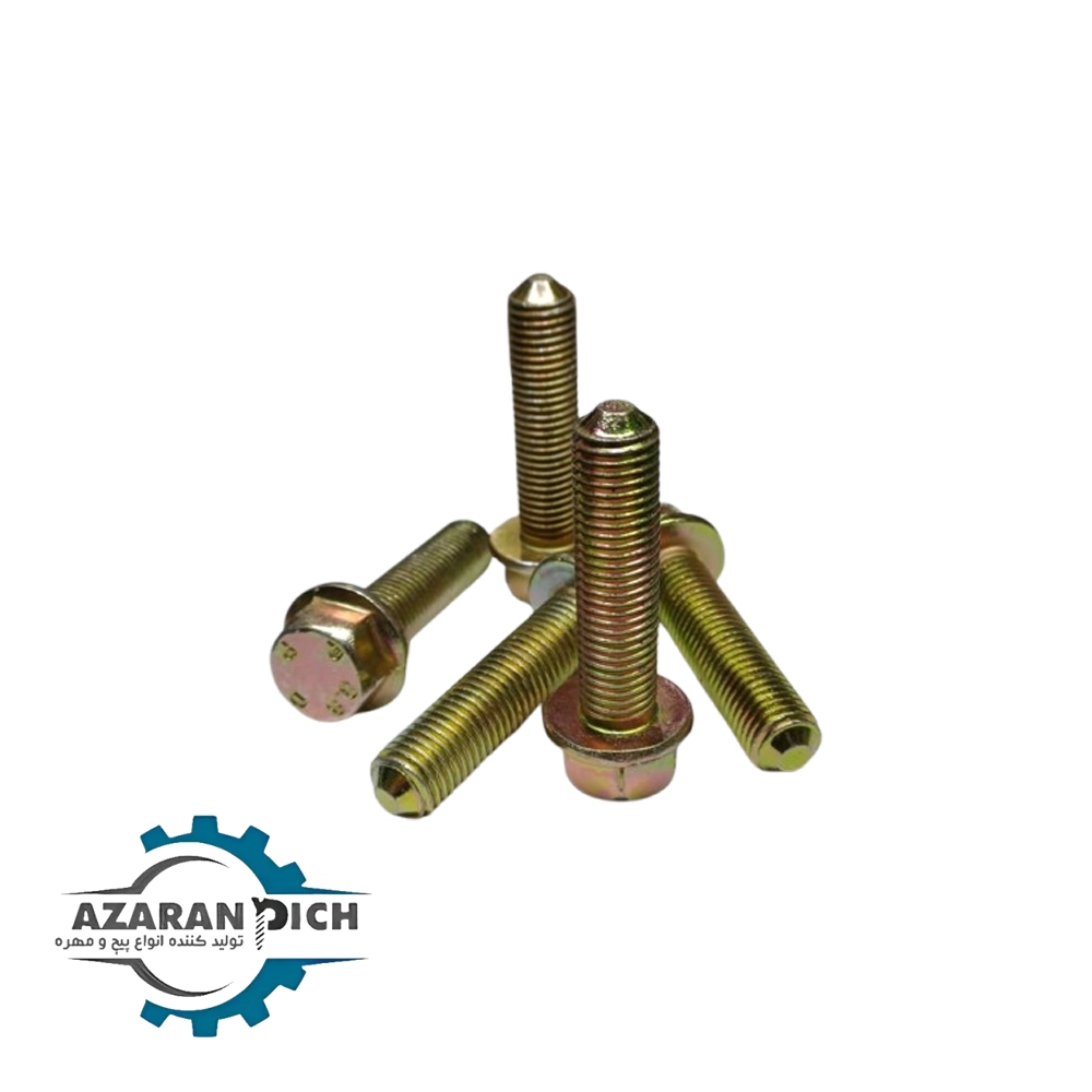 این پیچها از فولاد کربنی یا آلیاژی ساخته شده و پس از عملیات حرارتی، مقاومت مکانیکی بسیار بالایی پیدا میکنند. وجود واشر یکپارچه باعث توزیع یکنواخت فشار و جلوگیری از شل شدن پیچ میشود.